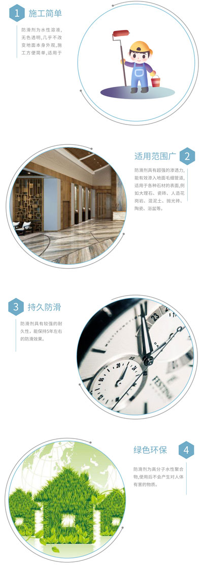 本纳米瓷砖防滑剂能有效提高湿滑底面的防滑效果,均具有较好的防滑效果,而且本纳米防滑剂具有无气味、与各类材料发生显微反应速度快、防滑系数高、对瓷砖表面的伤害小等特点。